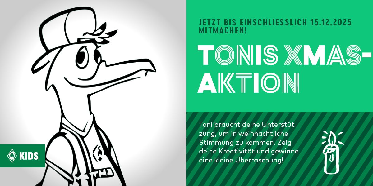 Mal jetzt deinen Weihnachts-Toni und schicke uns bis zum 15.12.2025 ein Bild an kids@werder.de. Deiner Fantasie sind dabei keine Grenzen gesetzt.