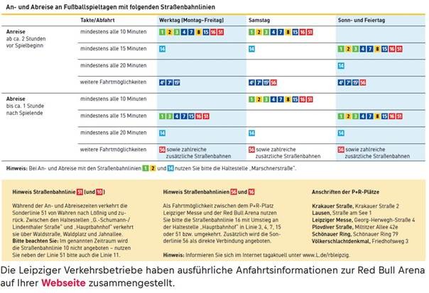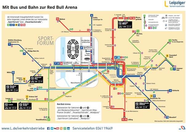 Die Eintrittskarten enthalten eine Fahrtberechtigung (fünf Stunden vor und fünf Stunden nach dem Spiel) in den öffentlichen Verkehrsmitteln des MDV im gesamten Stadtgebiet (Zone 110). Zur Red Bull Arena fahren die Straßenbahnlinien 1, 2, (Haltestelle „Marschnerstraße“) 3, 4, 7, 8 und 15 (Haltestelle „Sportforum Süd“, „Sportforum Ost oder „am Mückenschlößchen“).