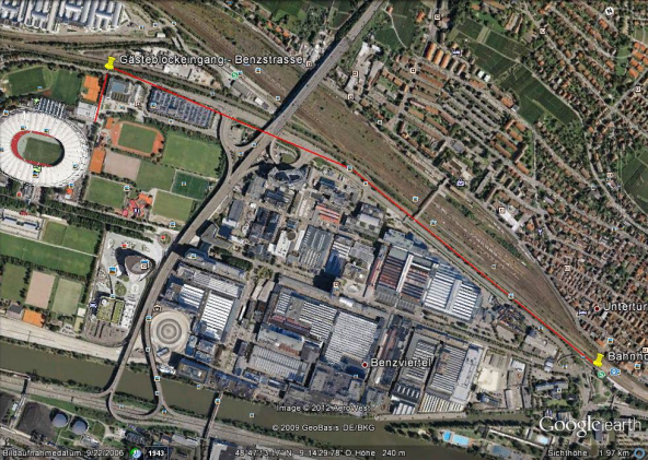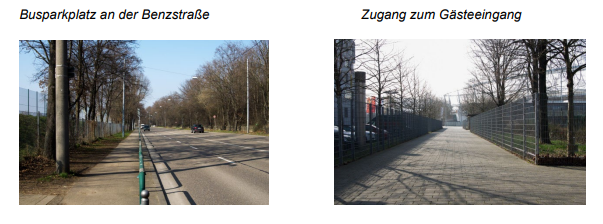Parkmöglichkeiten für Gästefanbusse befinden sich in der Benzstraße. Von dort aus gelangt man direkt zum Gästeeingang.