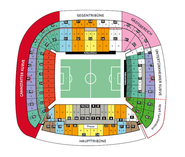 Im Bereich der Untertürkheimer Kurve befinden sich die Plätze der Rollstuhlfahrer und Sehbehinderten. Es stehen 10% des Gesamtkontingents zur Verfügung. Der Eingang für Gästefans erfolgt über das Tor 17 im Fritz-Walter-Weg. Dort stehen euch die ehrenamtlichen Helfer des Teams Barrierefrei als Ansprechpartner zur Seite. Die Plätze für Fans mit Sehbehinderung befinden sich im Block 75 A und B. Volunteers stehen hier als Ansprechpartner und Betreuung zur Seite. Weitere Informationen zu finden unter: barrierefrei-ins-Stadion