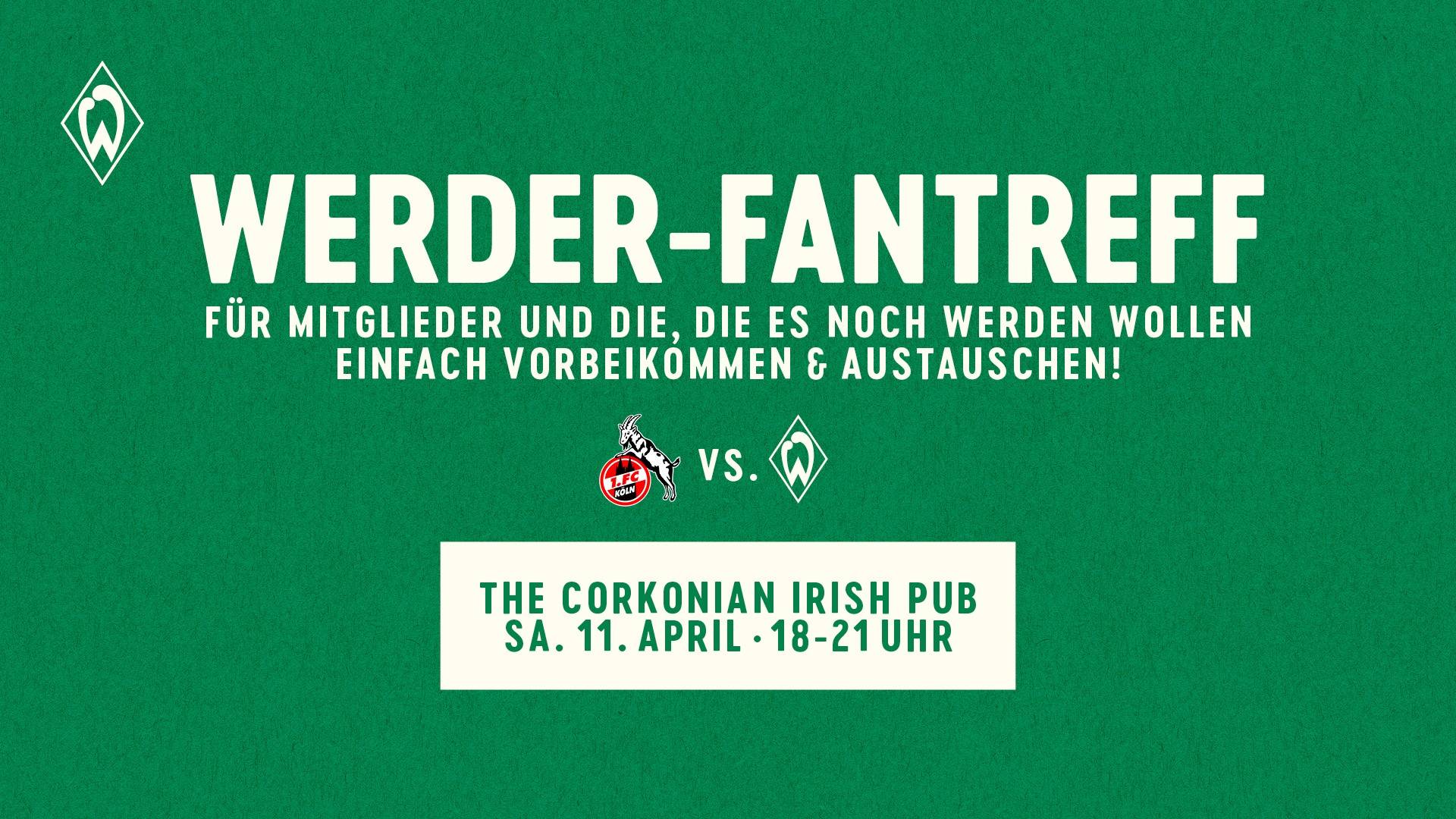 Dazu sind alle Mitglieder und Werder-Fans, die sich austauschen und Vorfreude entwickeln wollen, herzlich eingeladen, am Samstagabend, 11.04.2026, von 18.00 bis 21.00 Uhr den „The Corkonian Irish Pub“ in Köln zu besuchen. Auch der eine oder die andere Vertreter*in des SVW wird an dem Abend vorbeischauen, bevor wir am Sonntag alle gemeinsam drei Punkte mit auf die Heimreise nehmen wollen.