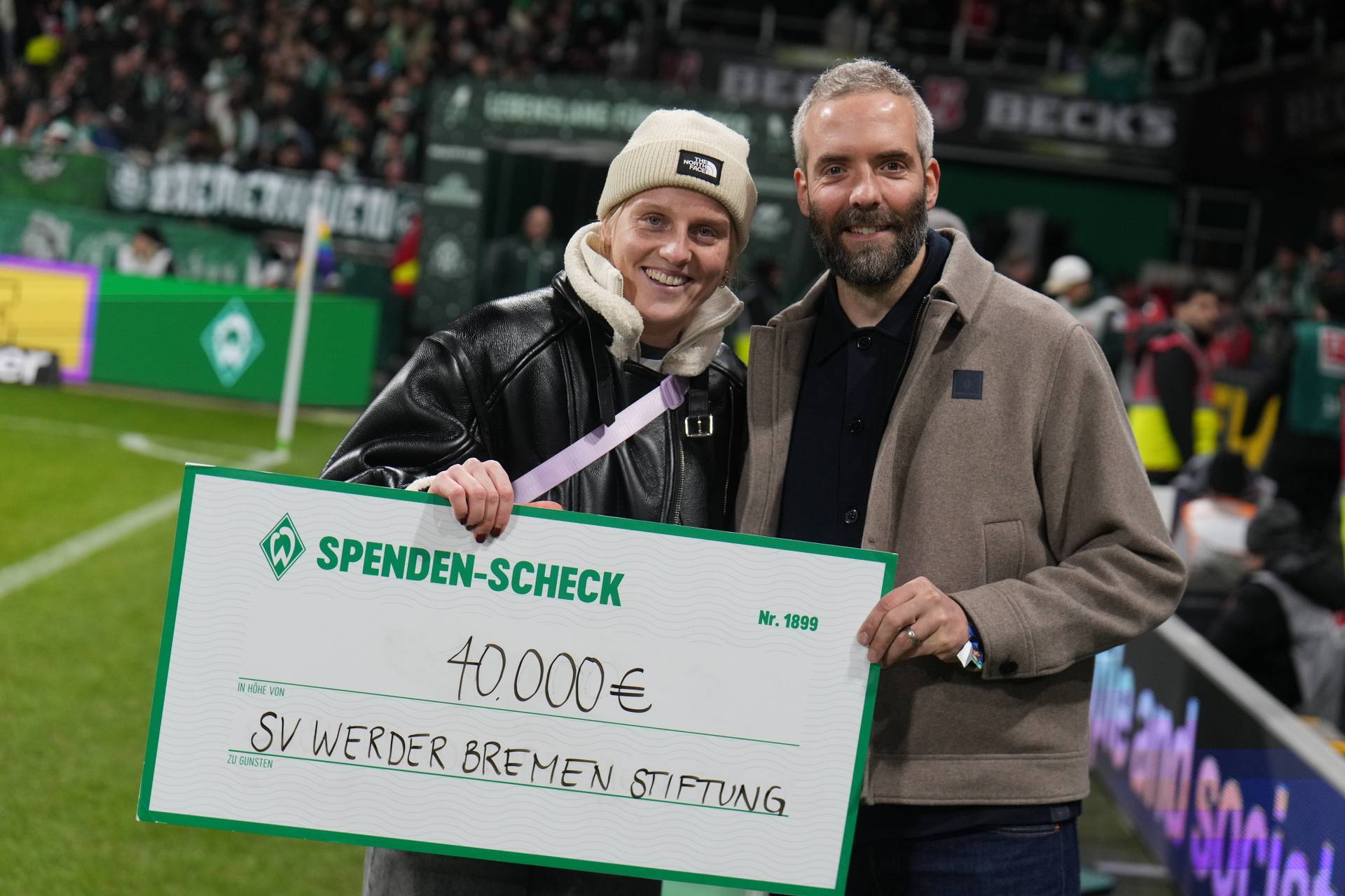Im Rahmen des Spiels gegen den VfB Stuttgart nahmen Stiftungsleiter Henrik Oesau und WERDERFRAUEN Kapitänin und Stiftungsrätin Lina Hausicke den symbolischen Scheck entgegen.