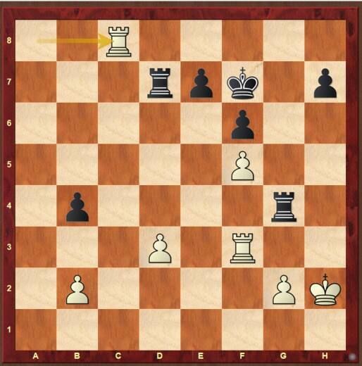 Natürlich musste ich gegen Yuri Boidman antreten, mit Schwarz. Er hatte eine unangenehme Überraschung in der Eröffnung parat, ich versuchte ihn aus seiner Vorbereitung zu bringen und geriet dadurch in eine schwierige Stellung bei hohem Zeitverbrauch. Trotzdem konnte ich mich im Mittelspiel befreien und ein ausgeglichenes Turmendspiel erreichen (Diagramm). Sein letzter Zug war 41.Tc8. Ich suchte nach einem „sicheren“ Remisweg und verfiel auf das blöde 41… Tgd4?, übersah dabei aber eine Kleinigkeit und verlor einen Bauern.