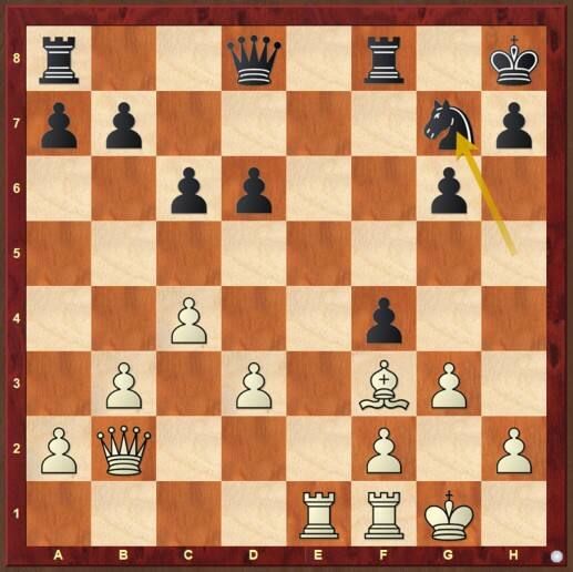 Die 5. Runde bescherte mir eine Weißpartie gegen den Koblenzer Wolfgang Polster. Wir konnten uns beide nicht erinnern, aber tatsächlich hatten wir 1989 in der 2. Bundesliga West schon einmal gegeneinander gespielt, damals mit dem besseren Ende für mich. Diesmal griff ich schon frühzeitig in der Eröffnung daneben und geriet nach 12 Zügen in eine schwierige Stellung (siehe Diagramm). Weiß steht schlechter und ich überlegte schon eine Weile an der Notbremse 13. Le4 Lg4 14.Lxd4 exd4 15.f2-f3. Aber dann sah ich eine kleine Verbesserung in dieser Variante …