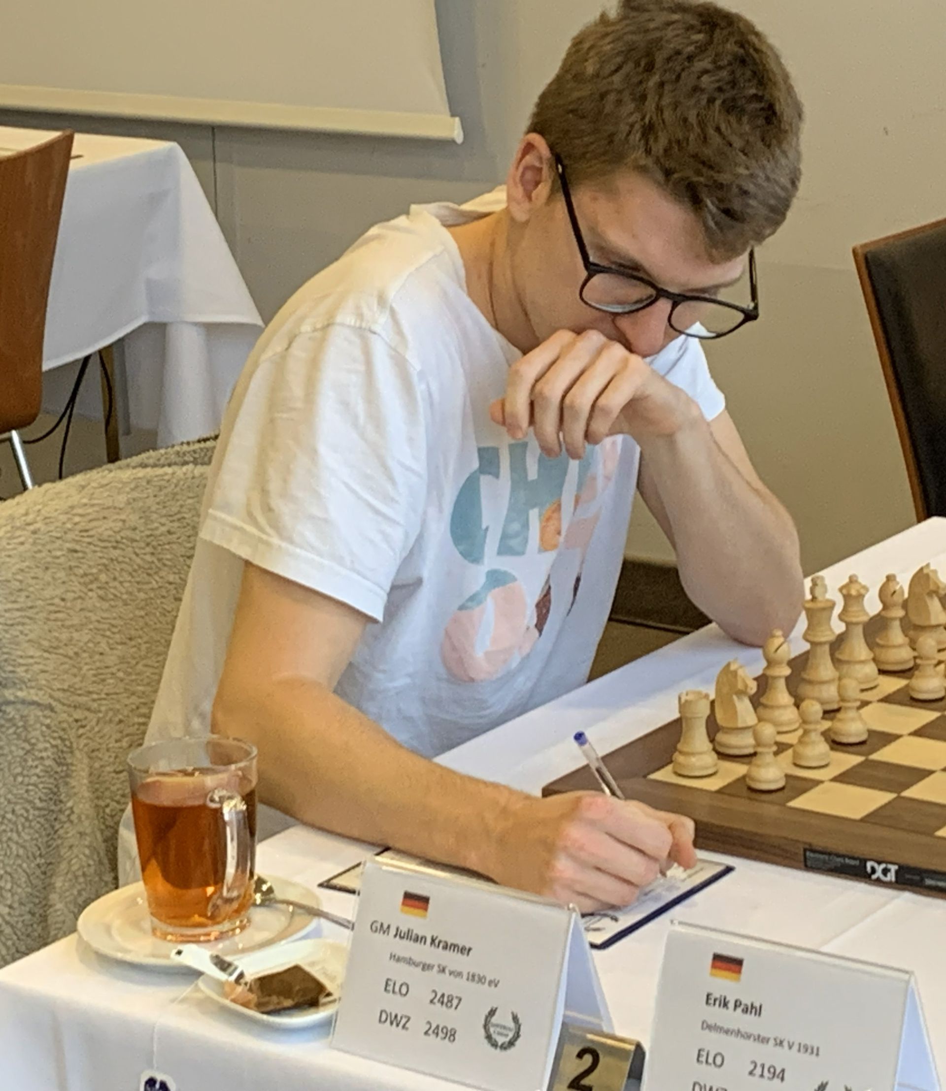 Weniger gut erging es seinem Bruder Erik – die Stellung gegen Julian Kramer war bis ins Mittelspiel im Gleichgewicht, aber für den Hamburger Großmeister angenehmer zu spielen und nach einigen kleinen Ungenauigkeiten musste Erik die Qualität geben und hatte keine Chance mehr.