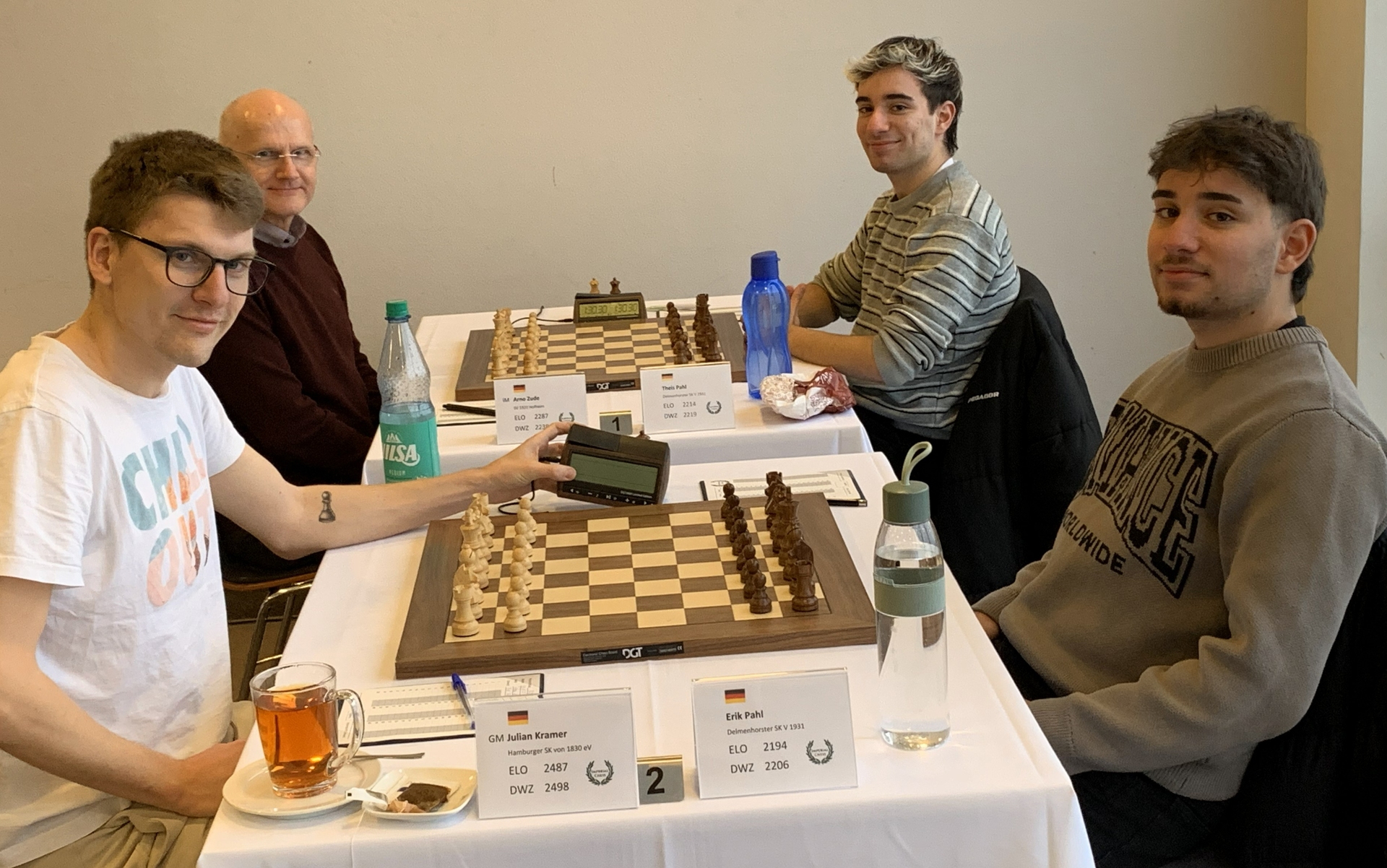 In diesem illustren Quartet befinden sich neben dem Favoriten GM Julian Kramer vom Hamburger SK auch unsere Bundesligaspielerin WIM Lara Schulze, der langjährige Hofheimer Bundesligaspieler IM Arno Zude (nebenbei auch amtierender Seniorenweltmeister im Problemlösen) und Theis Pahl von Delmenhorster SK.
