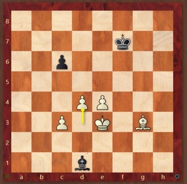 Richtig wäre dagegen 48...Lb3 49.Kd3 und jetzt das kunstvolle 49… La2! gewesen, wonach Weiß nicht weiterkommt: 50.c4 Lb1+ 51.Ke3 La2 52.d5!? Lxc4 53.dxc6 Ke7 – und die beiden Freibauern können blockiert werden.