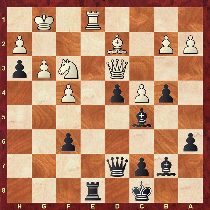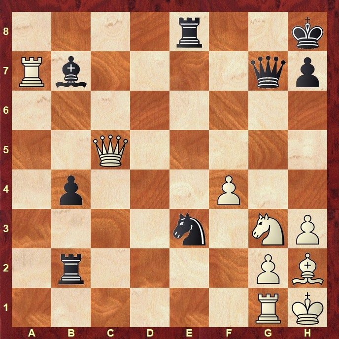 In der Diagrammstellung folgte ein Qualitätsopfer wie aus dem Lehrbuch: 27…Te3! 28.Lxe3 dxe3 29.De2 Dc6! 30.Tf1