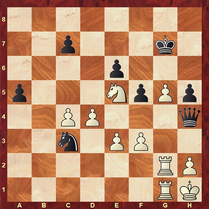 In der Diagrammstellung ist die Stellung nach 36…Txg2 37.Txg2 Dxb2 kritisch für Weiß. Stattdessen kam 36…Sxg2, was optisch noch stärker aussieht. Doch der Schein trügt! Martin, der bislang eine sehr starke Saison spielt, drehte mit 37.Db5! plötzlich den Spieß um und gewann ein paar Züge später.