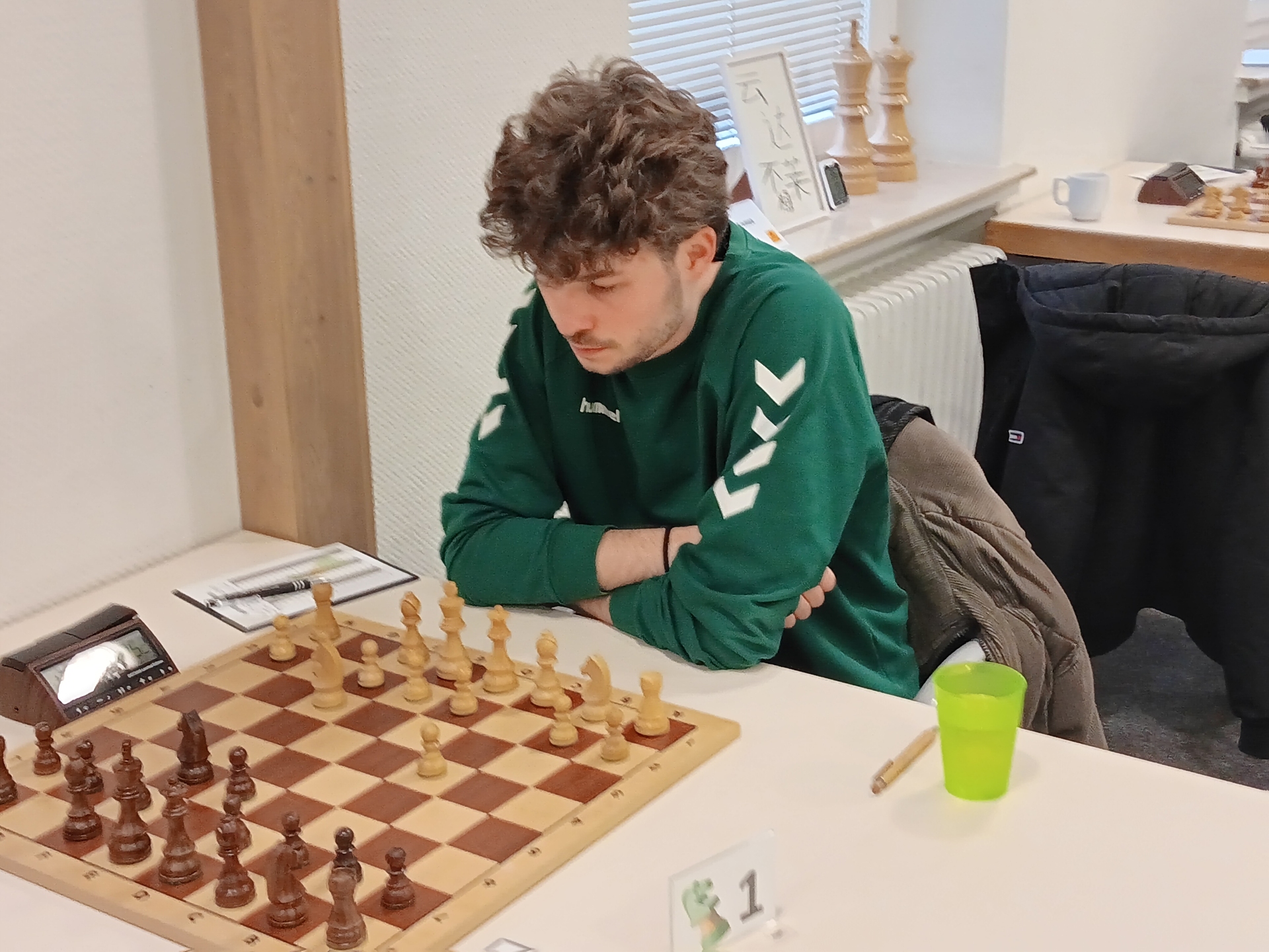 Besonders unglücklich verlief die Partie an Brett 7 zwischen IM Sven Joachim und IM Steven Geirnaert. Sven spielte sowohl zu Beginn als auch später über weite Strecken sehr gut und gewann mit Weiß bereits im 15. Zug die gegnerische Dame für Turm und Läufer. Zudem verfügte er über zwei Mehrbauern. Die Stellung war klar gewonnen und für Schwarz eigentlich nicht mehr spielbar. Allerdings ist eine Partie erst entschieden, wenn der Gegner tatsächlich aufgibt. Bis dahin sind höchste Aufmerksamkeit und das genaue Beachten gegnerischer Drohungen erforderlich. Leider unterlief Sven im 26. Zug ein grober Fehler, der direkt zum Partieverlust führte.