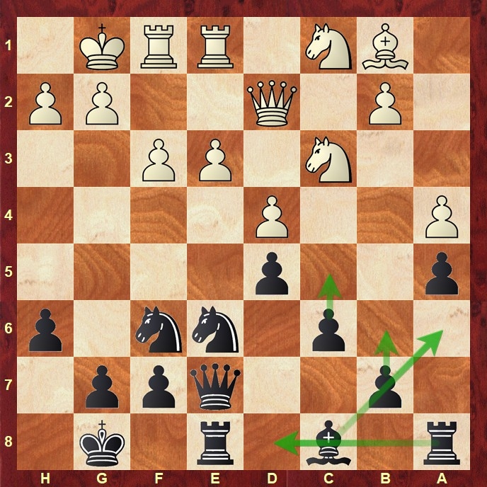 In der Diagrammstellung ist Schwarz nach 17…b6, gefolgt von La6, Td8 und c5, dabei, die Initiative zu übernehmen. Es folgte jedoch direkt 17…c5, was ebenfalls eine sehr typische und positionell starke Idee aus schwarzer Sicht in dieser Struktur ist. Allerdings kann Weiß hier mit 18.e4! den Spieß umdrehen. Dieser Zug ist sehr wirkungsvoll, da der Läufer nicht mehr auf d3, sondern auf b1 steht. Dies ermöglicht nach 18…dxe4 den Zwischenzug 19.d5! mit klarem Vorteil für Weiß. Collin spielte stattdessen 18…Td8, geriet jedoch weiterhin stark unter Druck und musste schließlich zwei Figuren für Turm und Bauer abgeben.