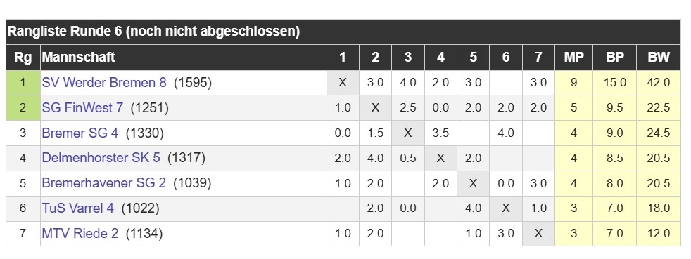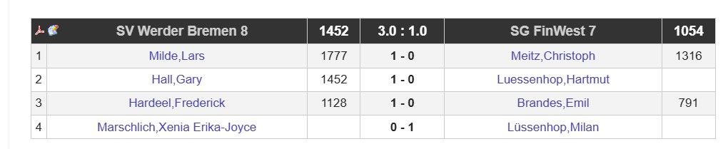 Vorletzte Runde, Erster gegen Zweiten, Spannung in der Luft und wahrscheinlich ein paar Herzschläge mehr als sonst am Brett: SV Werder Bremen 8 gegen SG FinWest 7. Kurz gesagt: Tabellenführerprüfung bestanden. Mit Stil. ♟️
