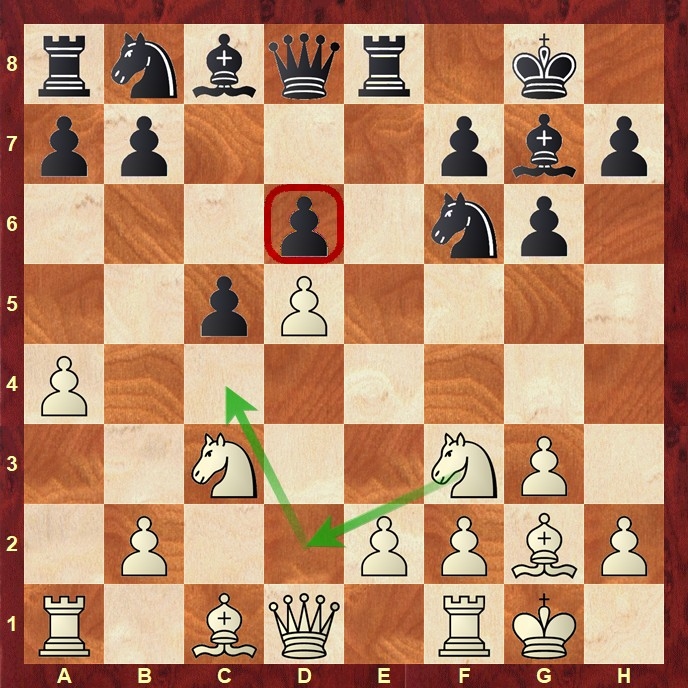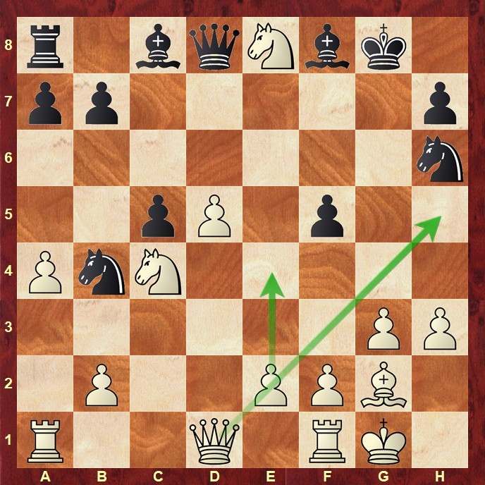 Zwar kann Weiß den Springer auf e8 nicht mehr retten, doch die Stellungsvorteile überwiegen deutlich. Nach 19.e4! Dxe8 20.e5! entstand ein starkes Zentrum mit verbundenen Freibauern, die im späteren Endspiel letztlich die Partie entschieden.