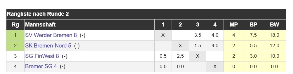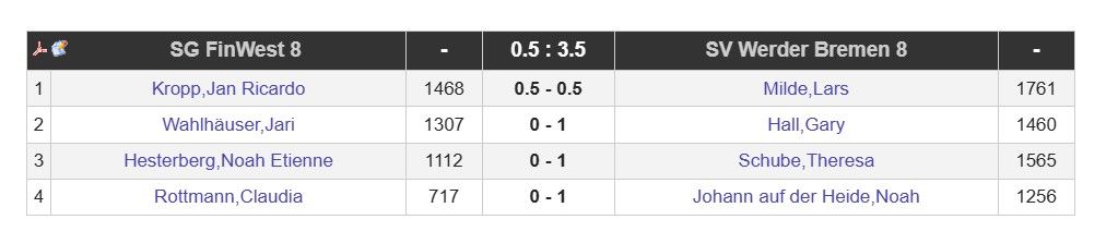 Was für ein Statement, was für ein langer Tag – und was für eine Mannschaft! Werder 8 hat mit einem souveränen 3,5:0,5-Erfolg gegen SG FinWest 8 nicht nur gewonnen, sondern den Aufstieg gleich mit erledigt. Kurz gesagt: Auftrag erfüllt, Liga bezwungen, Sekt kaltgestellt. 🥂