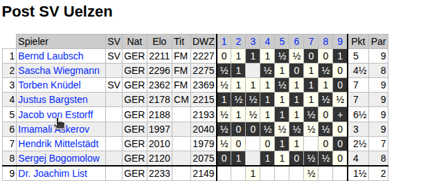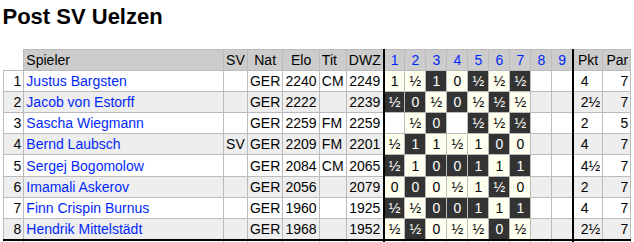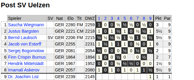 Und Uelzen, unser Gegner, Uelzen mochte auf dem Papier zwar etwas schwächer aufgestellt sein als wir, doch sind sie weithin bekannt für ihr schachliches Können, Robustheit und - aufgemerkt! – langjährige mannschaftliche Geschlossenheit.