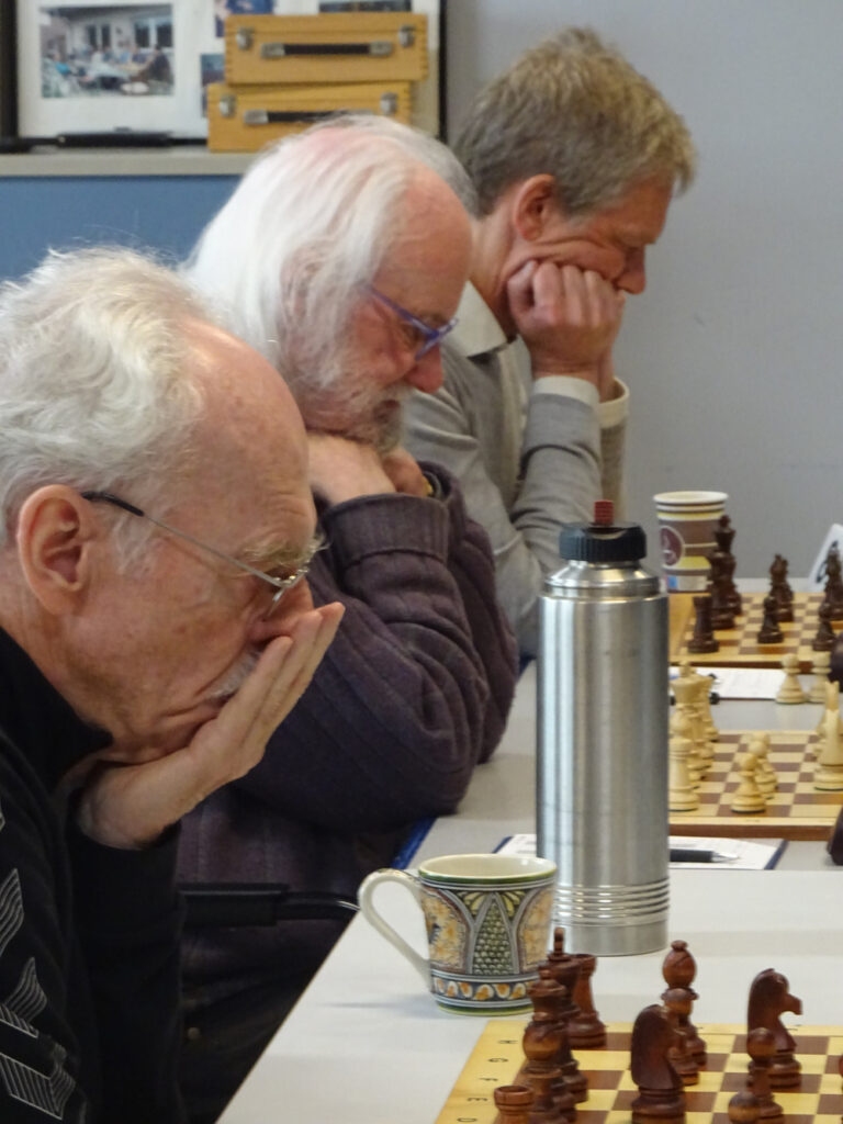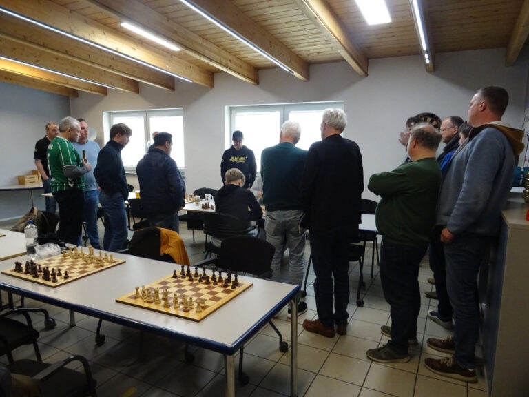Klar lagen wir zurück, hoch sogar mit drei Punkten. Allerdings nicht für lang – denn Reiner hatte einen d2-d4-Sahnetag erwischt und drückte Reinhold Happe langsam, aber sicher auf die Grundreihe zurück. Hübsch gemacht vom starken Prof, und Punkt für uns!