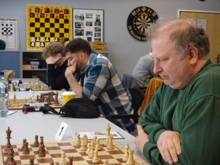 Es war GM Gennadiy, der mit einem austarierten Remis gegen Alexander Hoffmann die Punktskala ein wenig in Bewegung versetzte. Mehr noch gelang dies Peter, wenngleich nicht ganz in seinem Sinne – nach einer mutig ausgelassenen Zugwiederholung vertat sich Peter bei einer sehr langen Vorausberechnung und erlag einer Fesselung nebst Springergabel von Ingo Gronde.