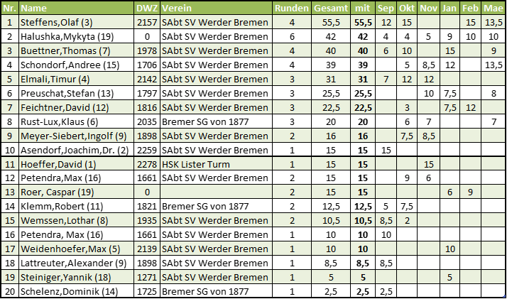 | 5 | Preuschat,Stefan | 1797 | SAbt SV Werder Bremen | 3.0 | 0 | 0 | 0 | 1 | ** | 0 | 1 | 1 |