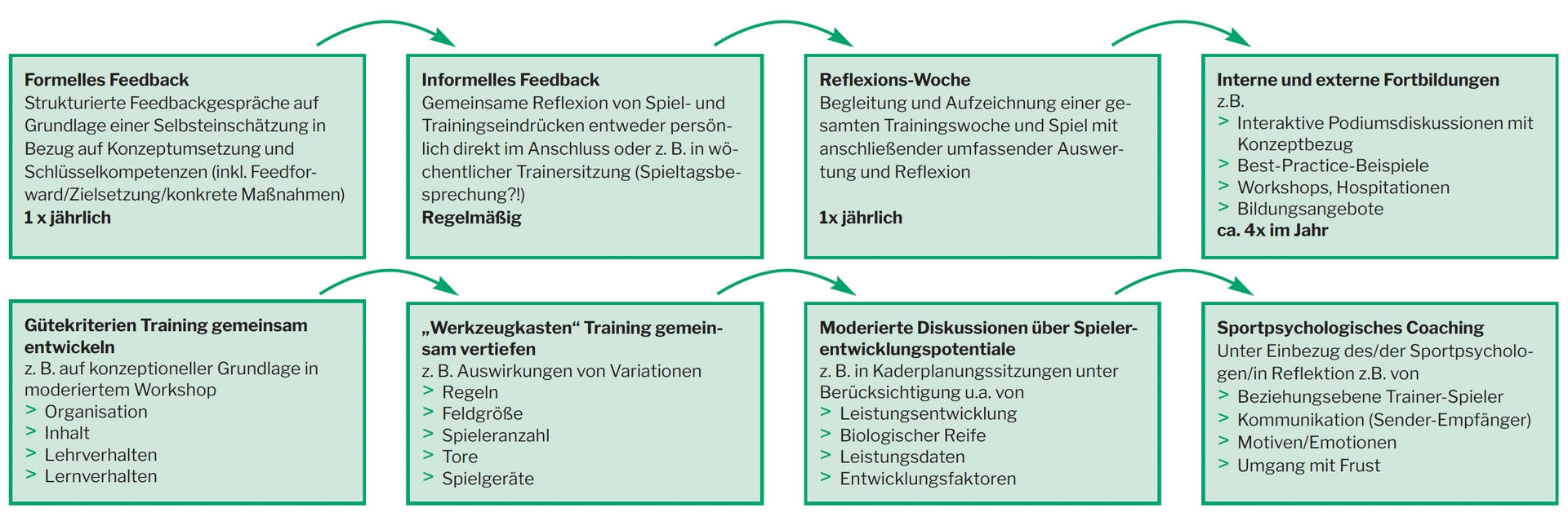 Somit ergeben sich auch für Trainer individuelle Entwicklungspläne auf der Basis ihrer Performance in Bezug auf Spielerentwicklung, Trainings- und Spieltagsgestaltung, Vermittlungsmethodik und Umsetzung der Trainerrolle.