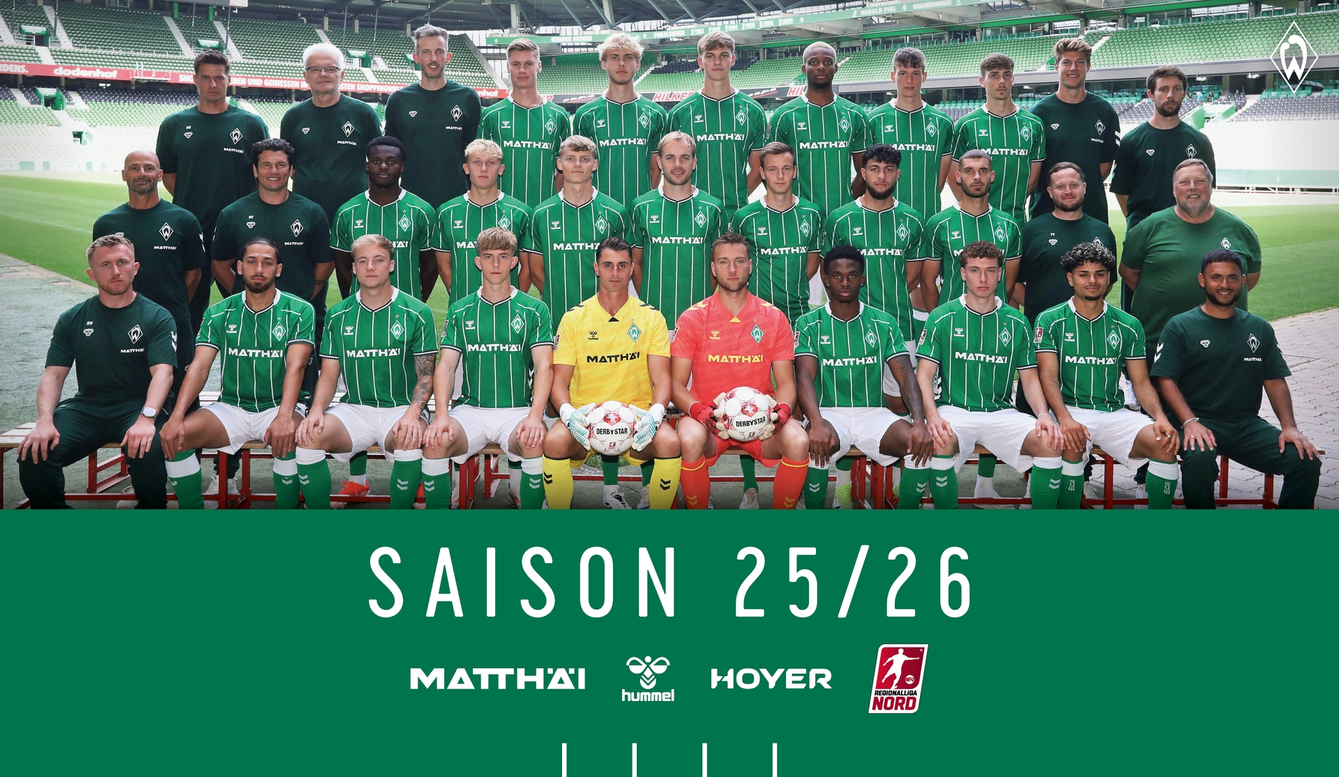 Hintere Reihe (v.l.n.r.): Manuel Klon (Torwart-Trainer), Stefan Mann (Zeugwart), Christian Schult (Analyst), Jannes Warnken, Lennart Baum, Mats Heitmann, Joel Imasuen, Dominik Kasper, Levi Wagner, Carl Weimer (Psychologe), Felix Schierholt (Physiotherapeut)